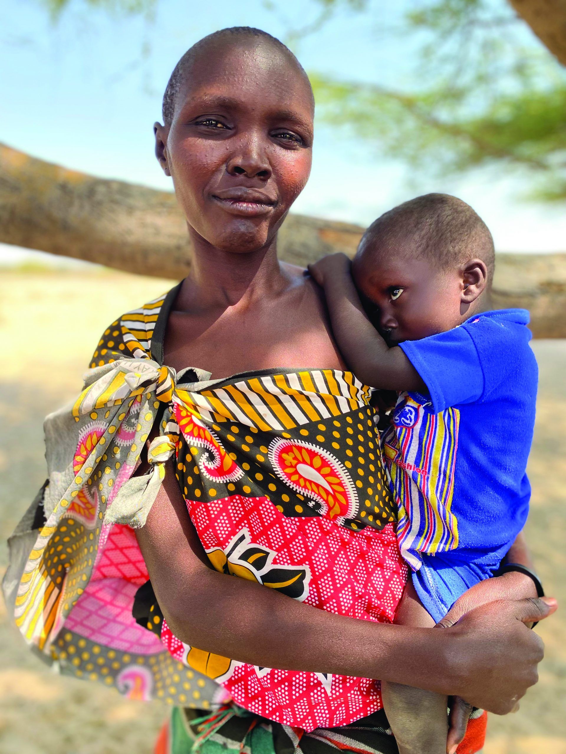 Paulina Ateir has set her youngest son down so he can play with pebbles on the dry ground while she concentrates on collecting money from the other women.