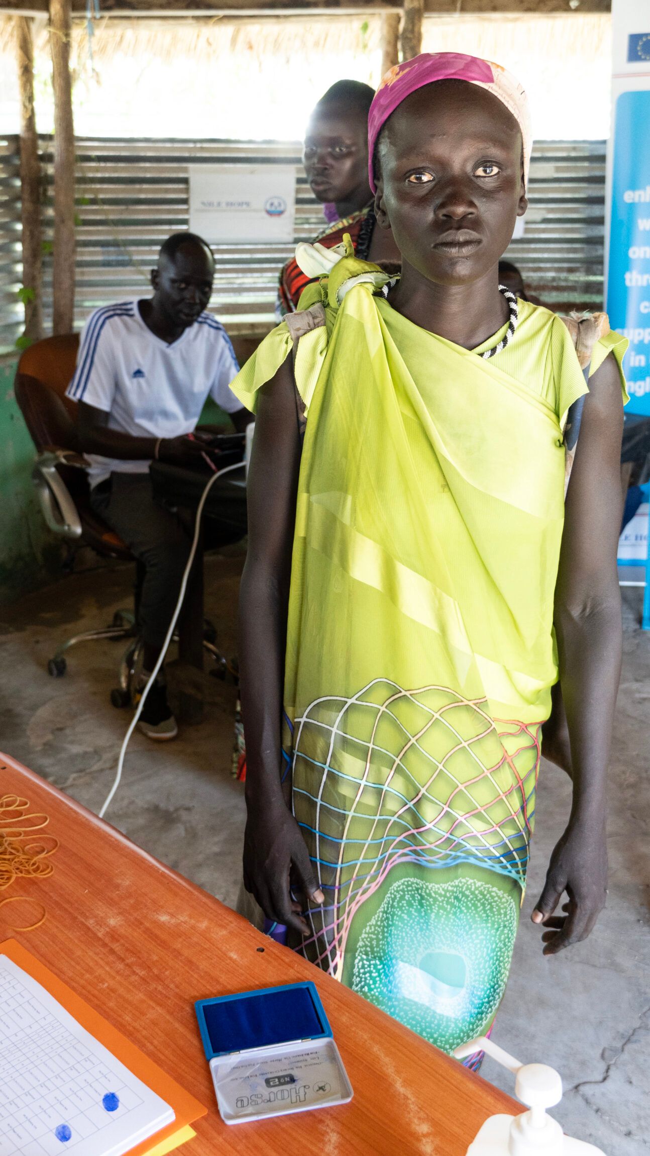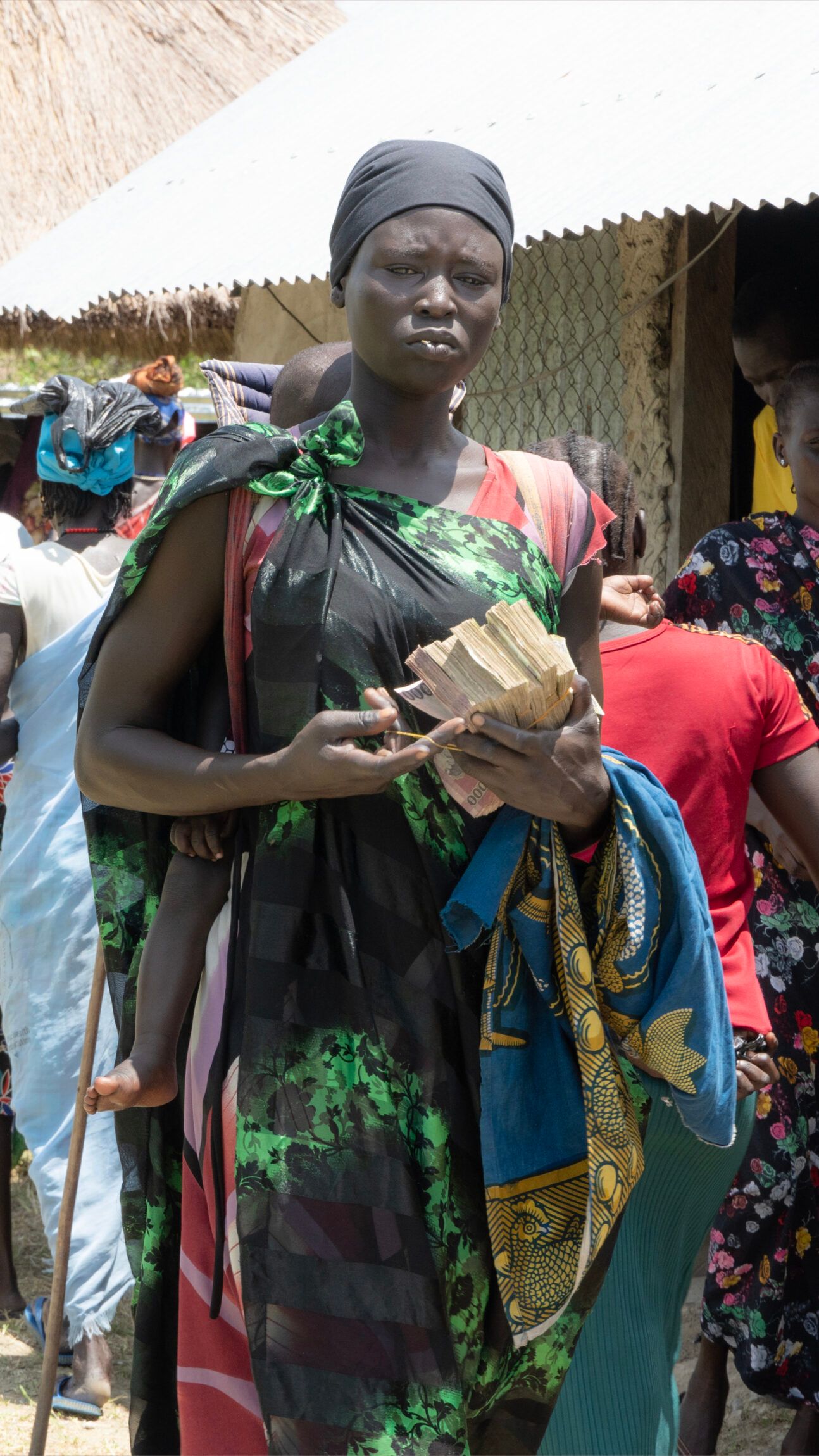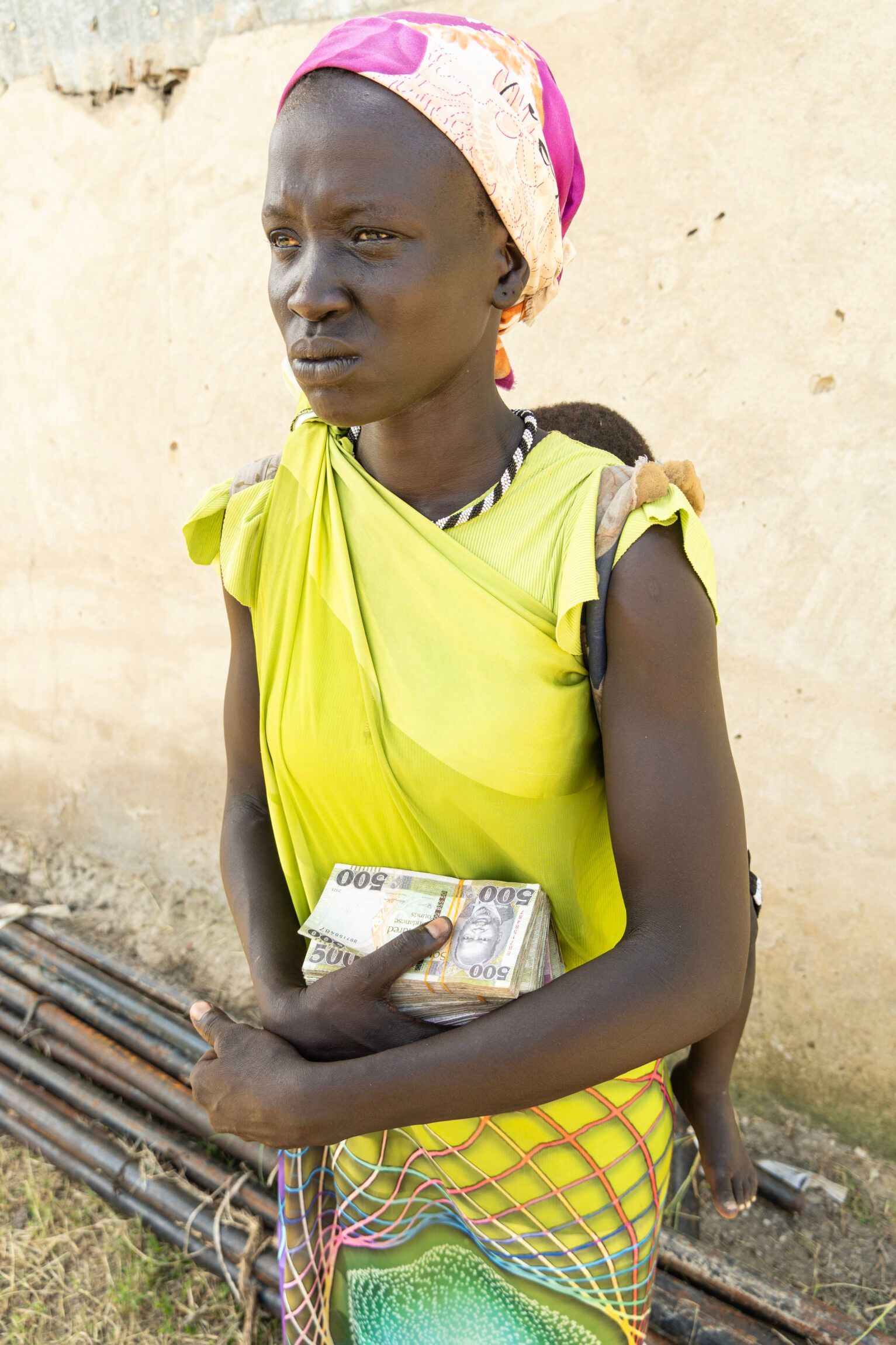 Kongkong Koruo is in her late twenties – she is not sure exactly how old she is. She has been waiting patiently in the shade of a tree since before 8 AM. She has her son strapped on her back. She is registered by Nile Hope and has received cash before – so she didn’t have to come early. But she has learned to take nothing for granted. Not least the goodness of others. And she has learned the hard way.