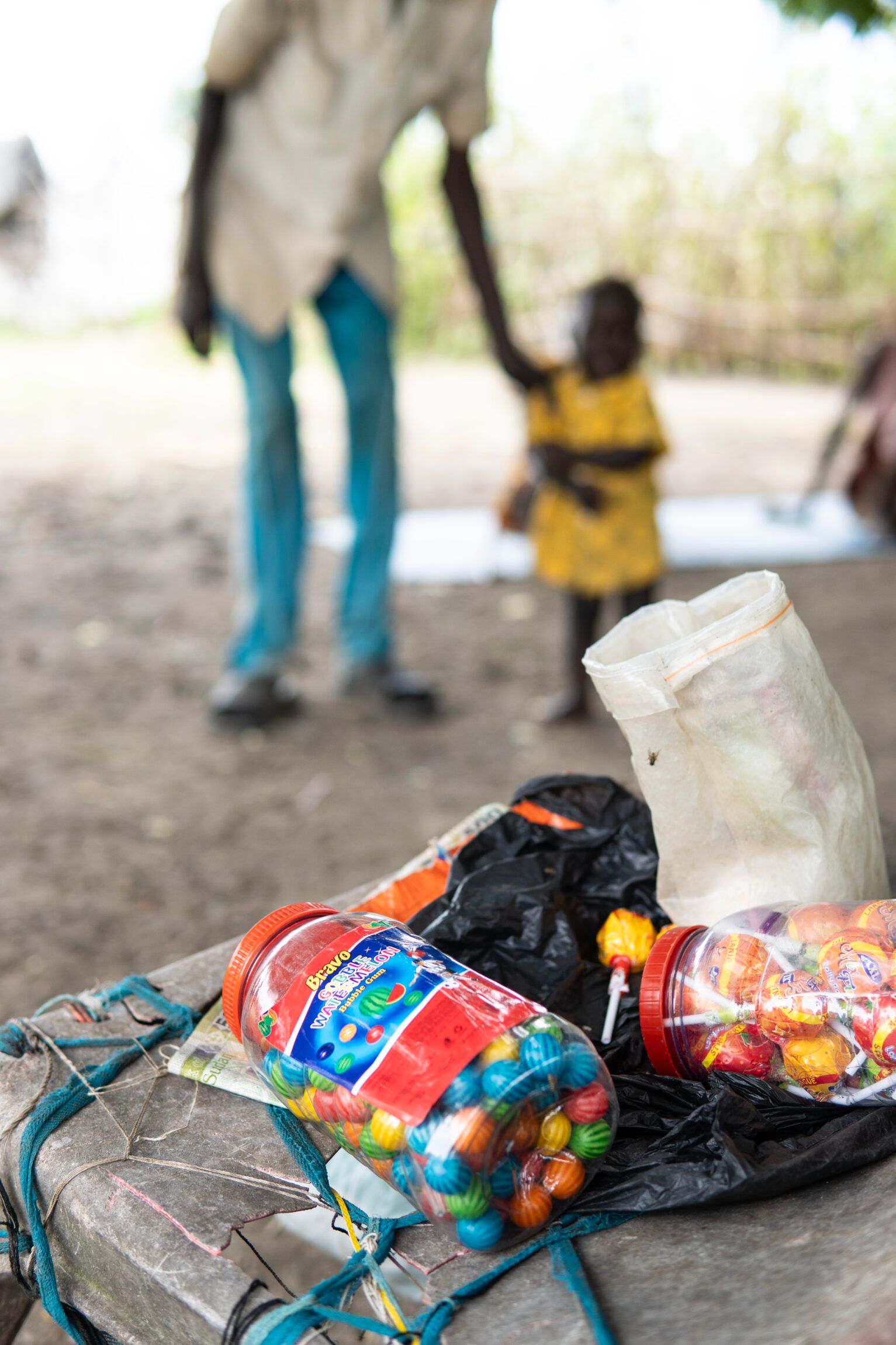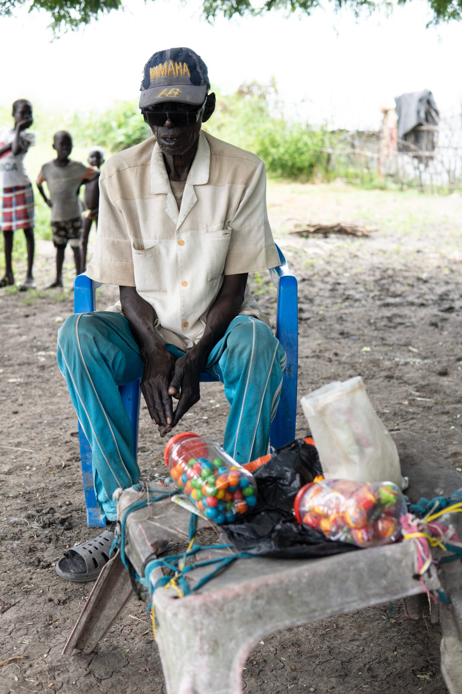 The shop can fit on the seat of a blue plastic chair – and consists of lollipops and gumballs that he sells to children and others with a sweet tooth in the neighbourhood.