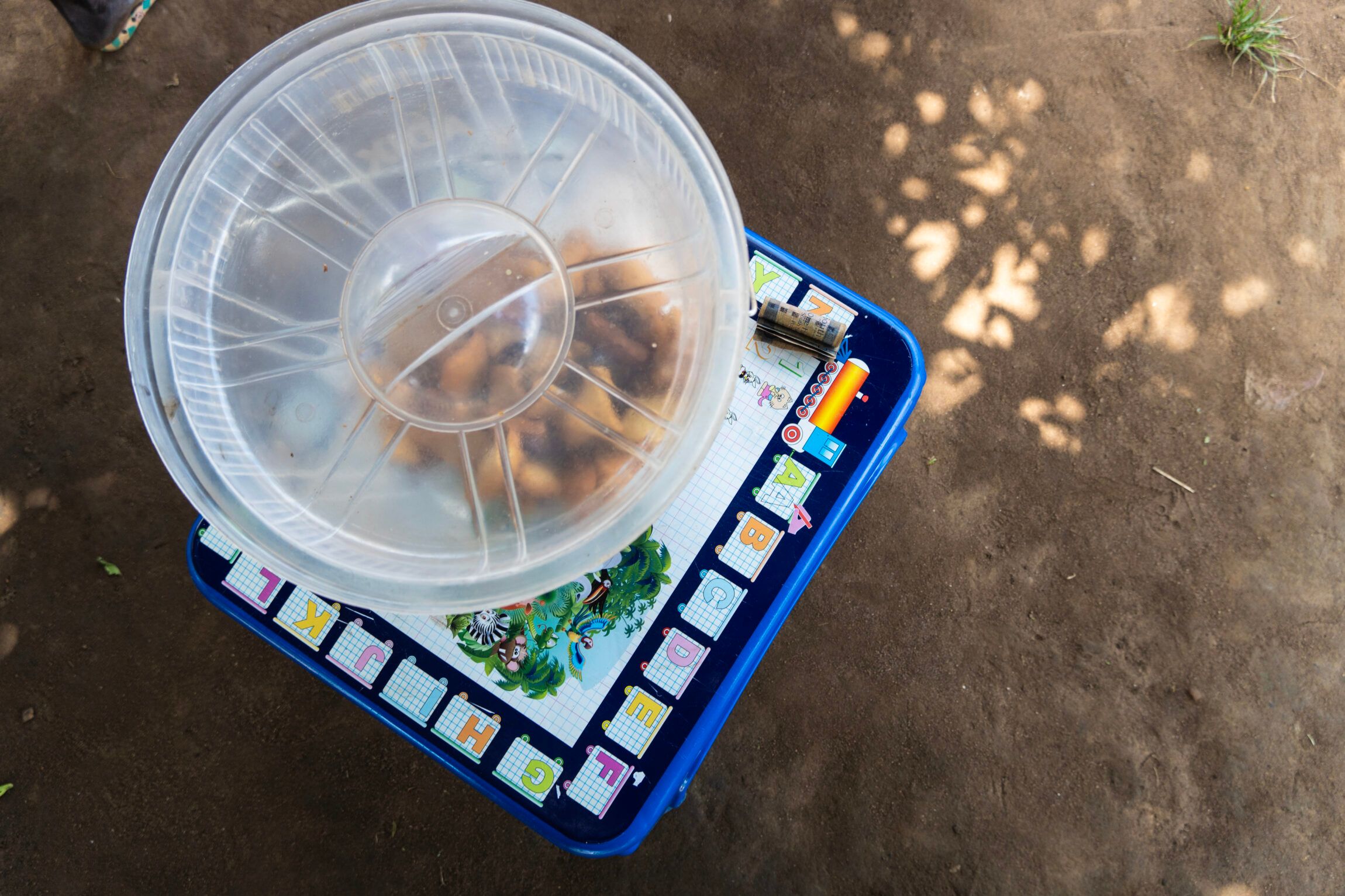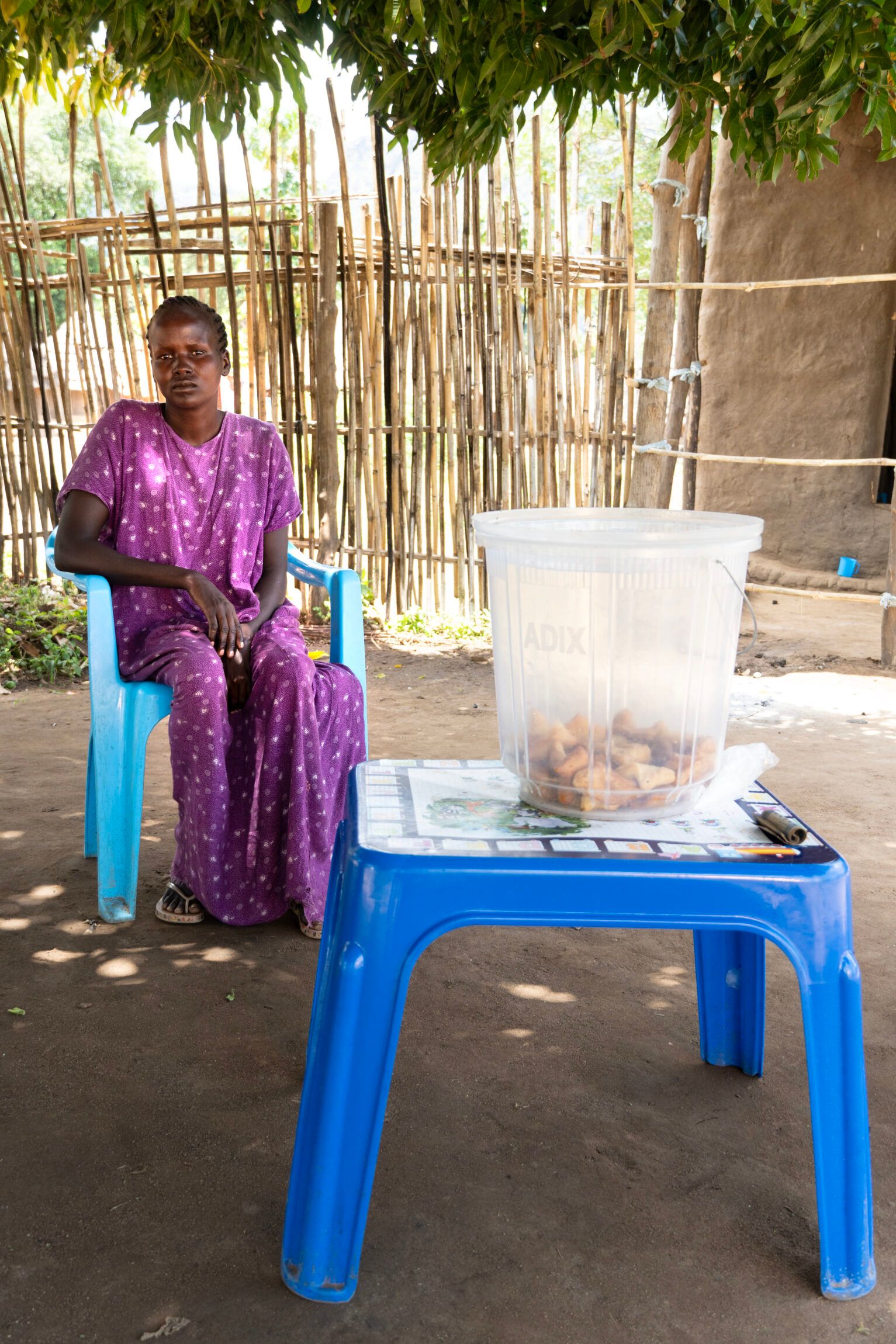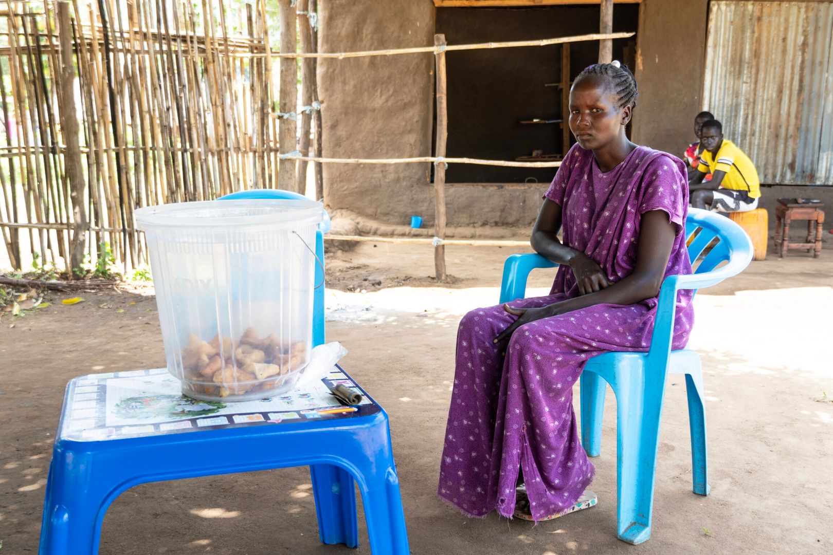 Irene Apule sits under a tree on a blue plastic chair next to a blue plastic table decorated with all the letters of the alphabet. On the table there’s a transparent plastic bucket with fried, sweet bread – mandazis – and a couple of South Sudanese pound notes rolled up next to it.