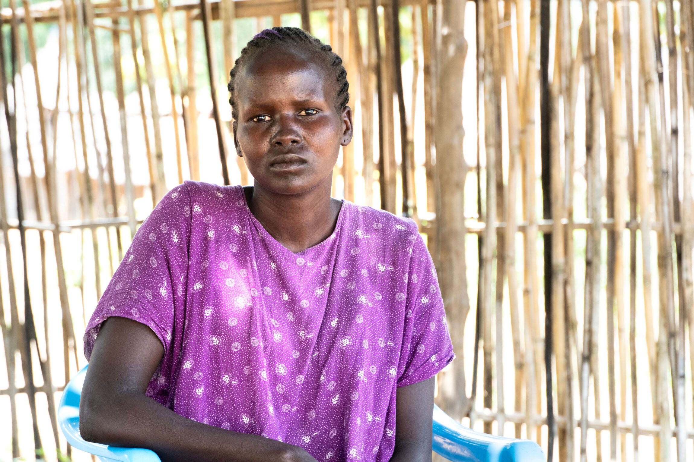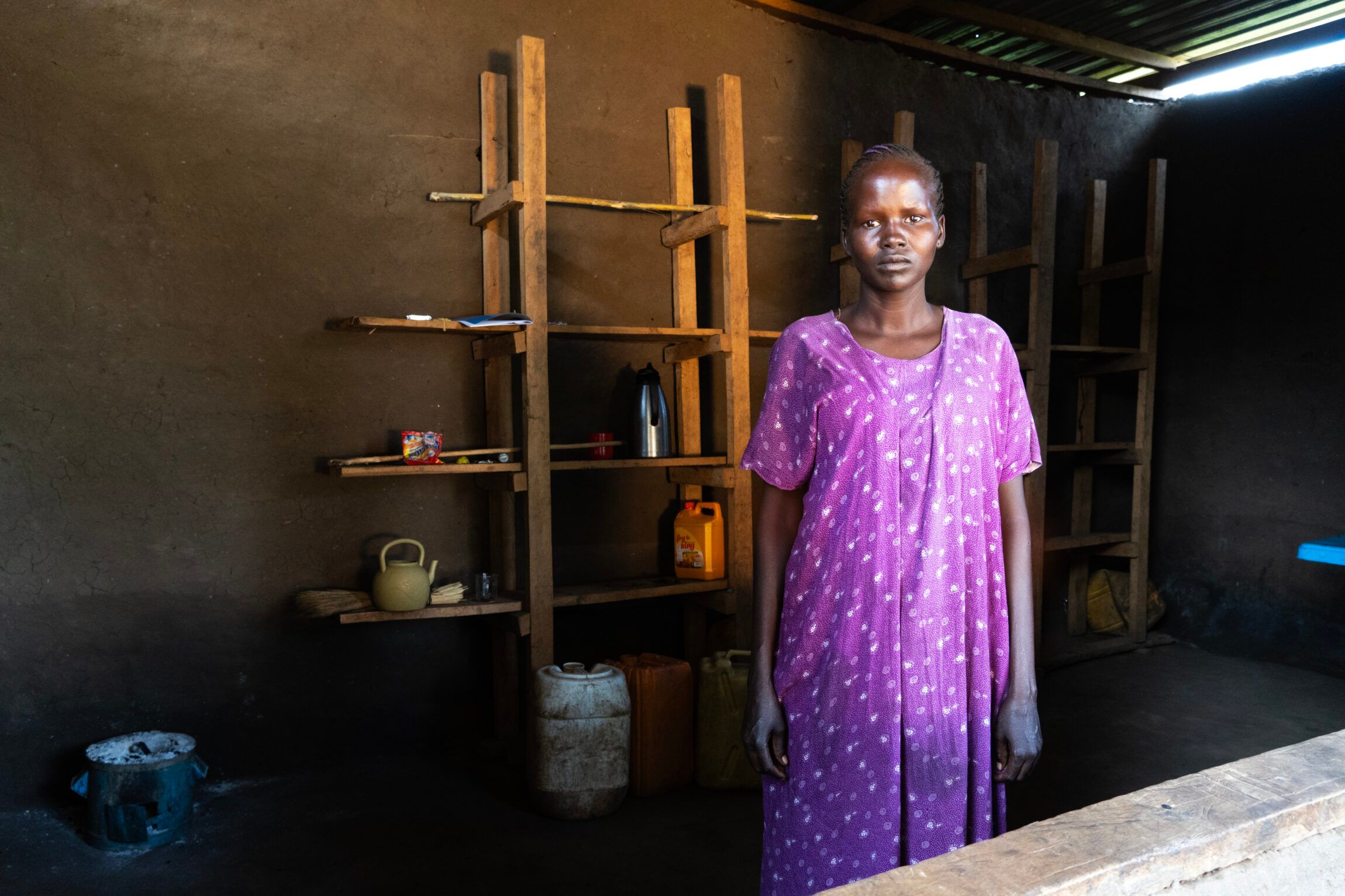 Behind her is a basic clay structure with an awning made of thin metal sheets – two young men are sitting under it in the shade. It’s midday in Chukudum – capital in Budi County in south-east South Sudan – and it’s hot.