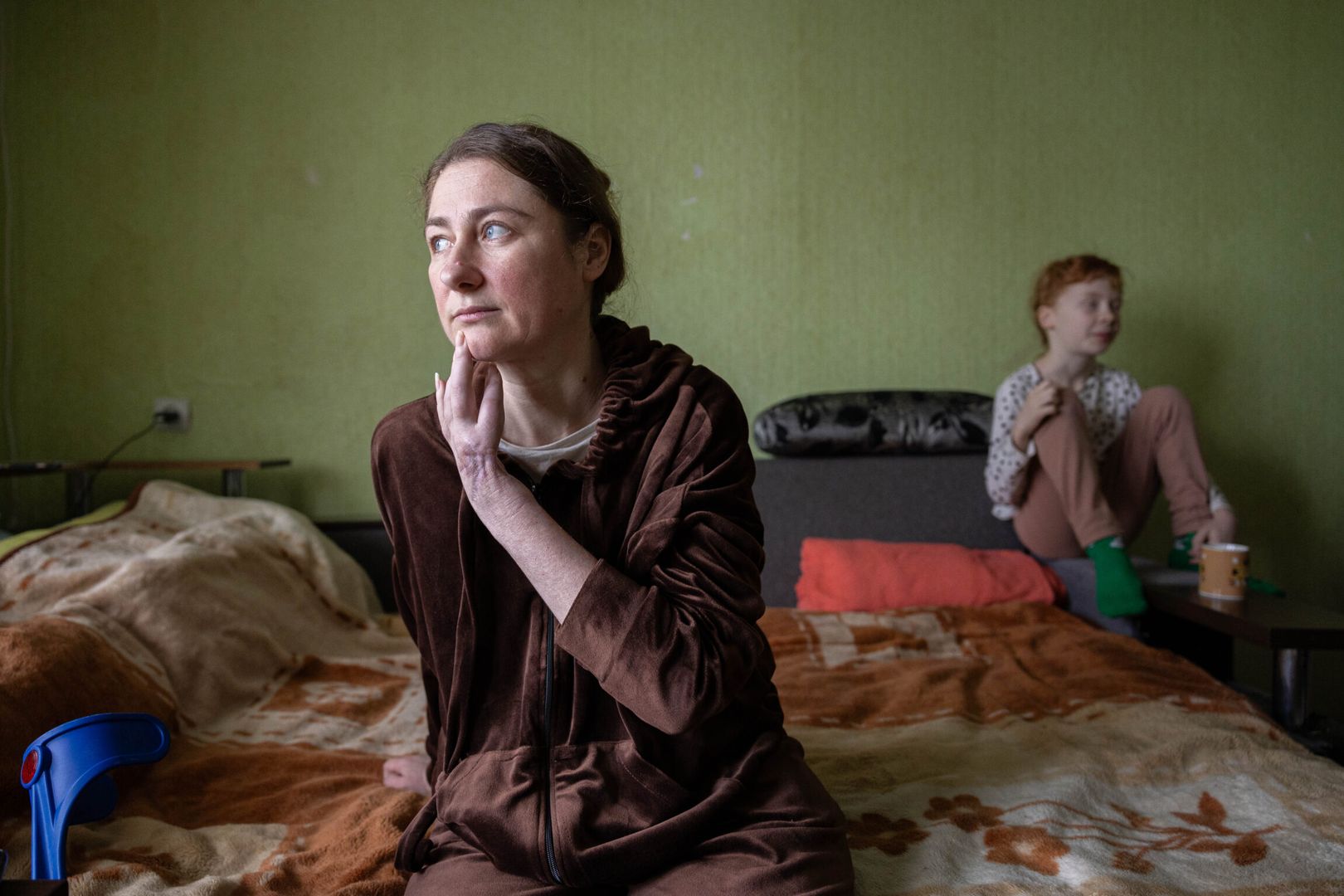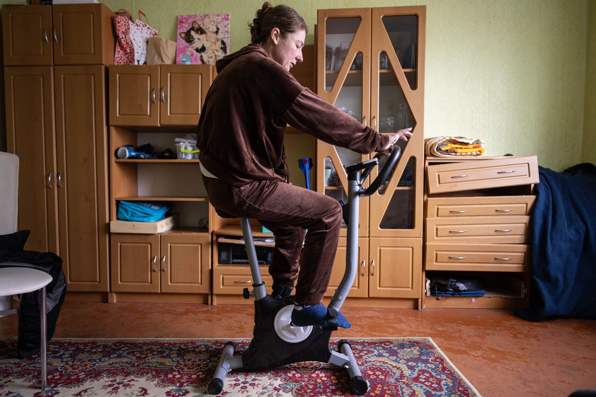 Even though Kateryna and her family are further away from the battlefield now, there are still clear scars on them that affect their daily lives. The physical scars are evident on Kateryna, who is missing parts of her left hand and left leg, making it difficult for her to move around the apartment. She tries to improve by using her exercise bike two to three times a day, but there is a long way to go, she says.