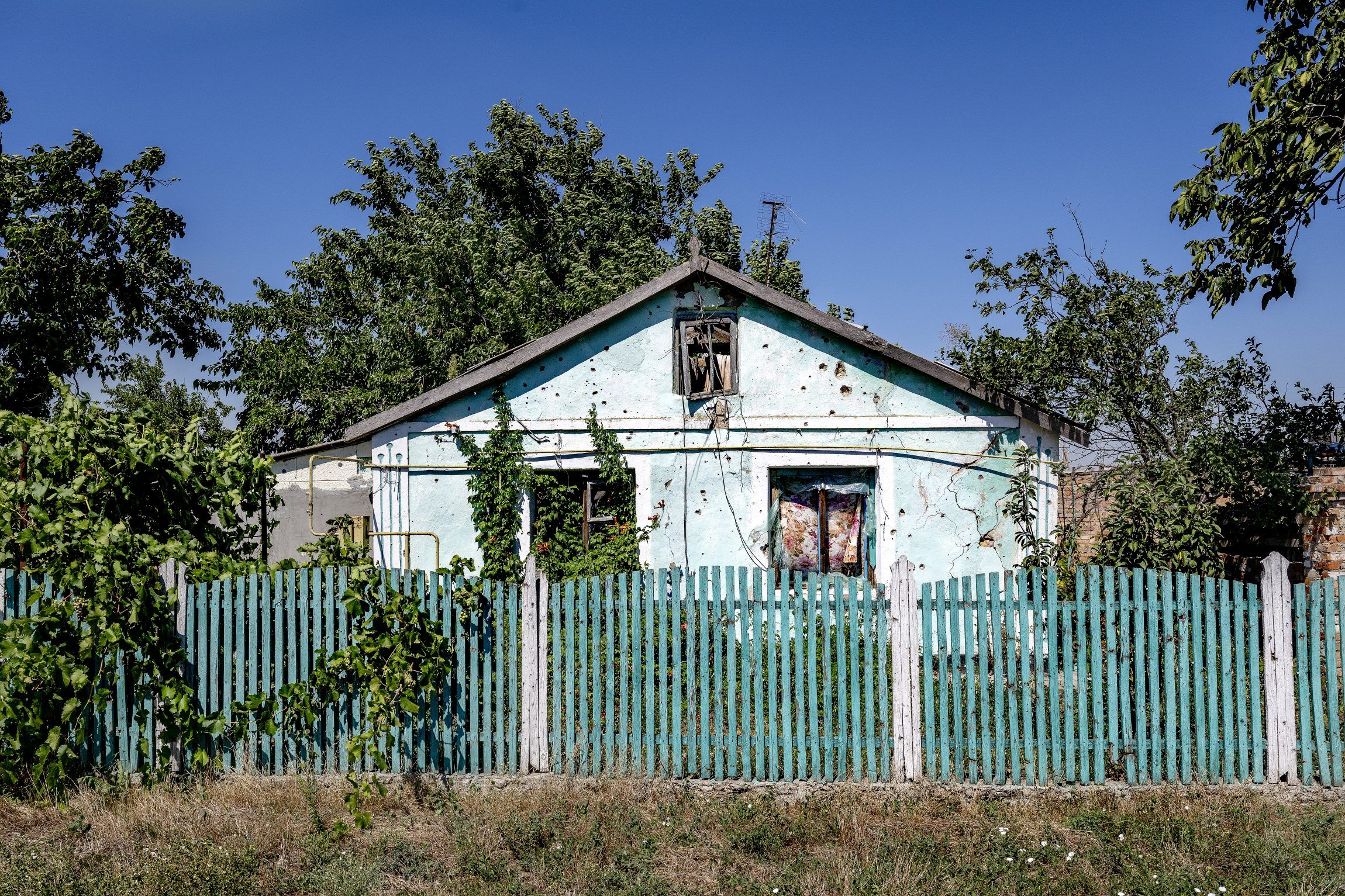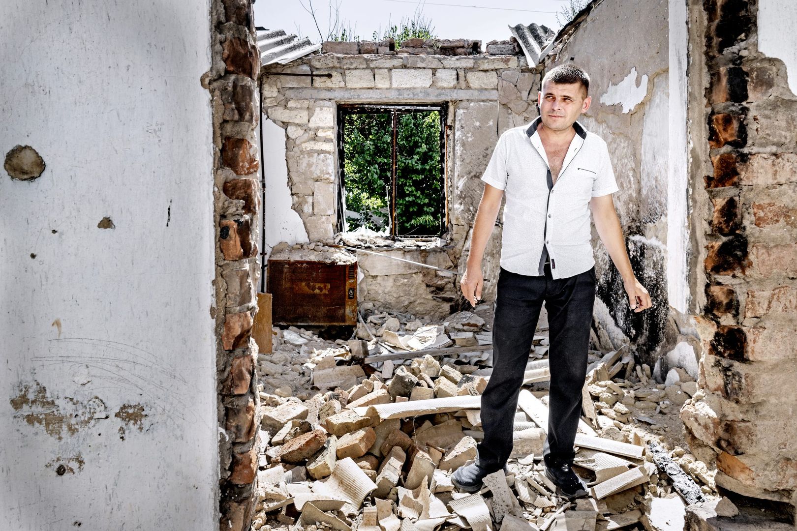 On the gravel road in front of Andrii’s house lies a crumbled part of an exploded rocket. Standing by the road, the house is barely visible through the wild overgrowth that surrounds the bullet-ridden walls without a roof. The ruins of the house were once Andrii’s home.