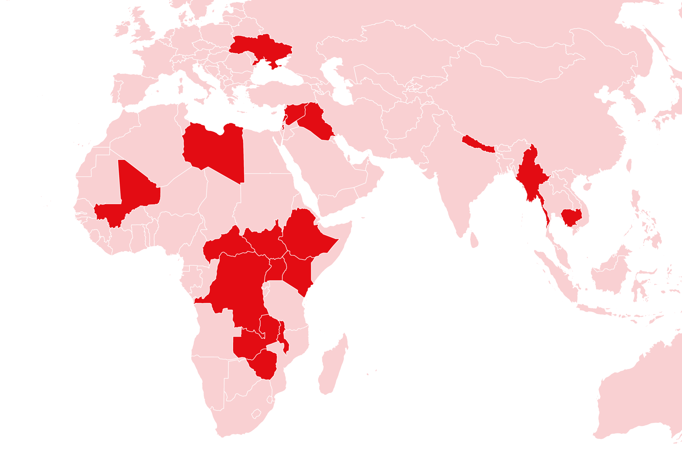 Sub-Saharan Africa Central African Republic (CAR)Democratic Republic of CongoEthiopiaKenyaMalawiMaliSouth SudanUgandaZambiaZimbabwe Europe Ukraine Middle East/North Africa IraqLebanonLibyaPalestineSyria Asia CambodiaMyanmarNepal DCA works in 19 countries around the world (January 2024)